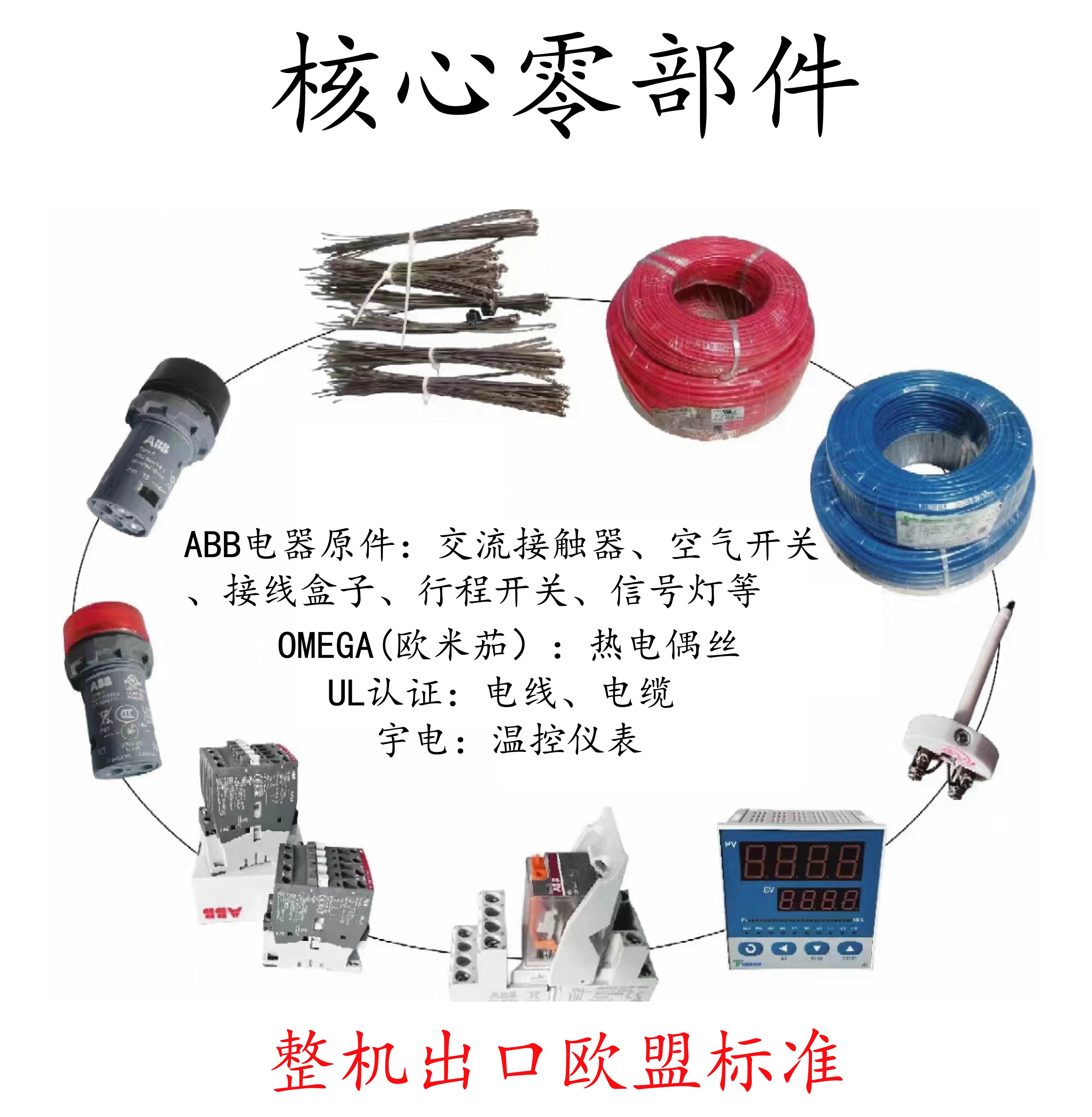 ?認證標準及核心零部件:整機核心部件均符合CE、UL、MET等認證標準;核心零部件有ABB電器元件,UL認證電線、電纜,歐米茄,宇電、歐陸儀表等。